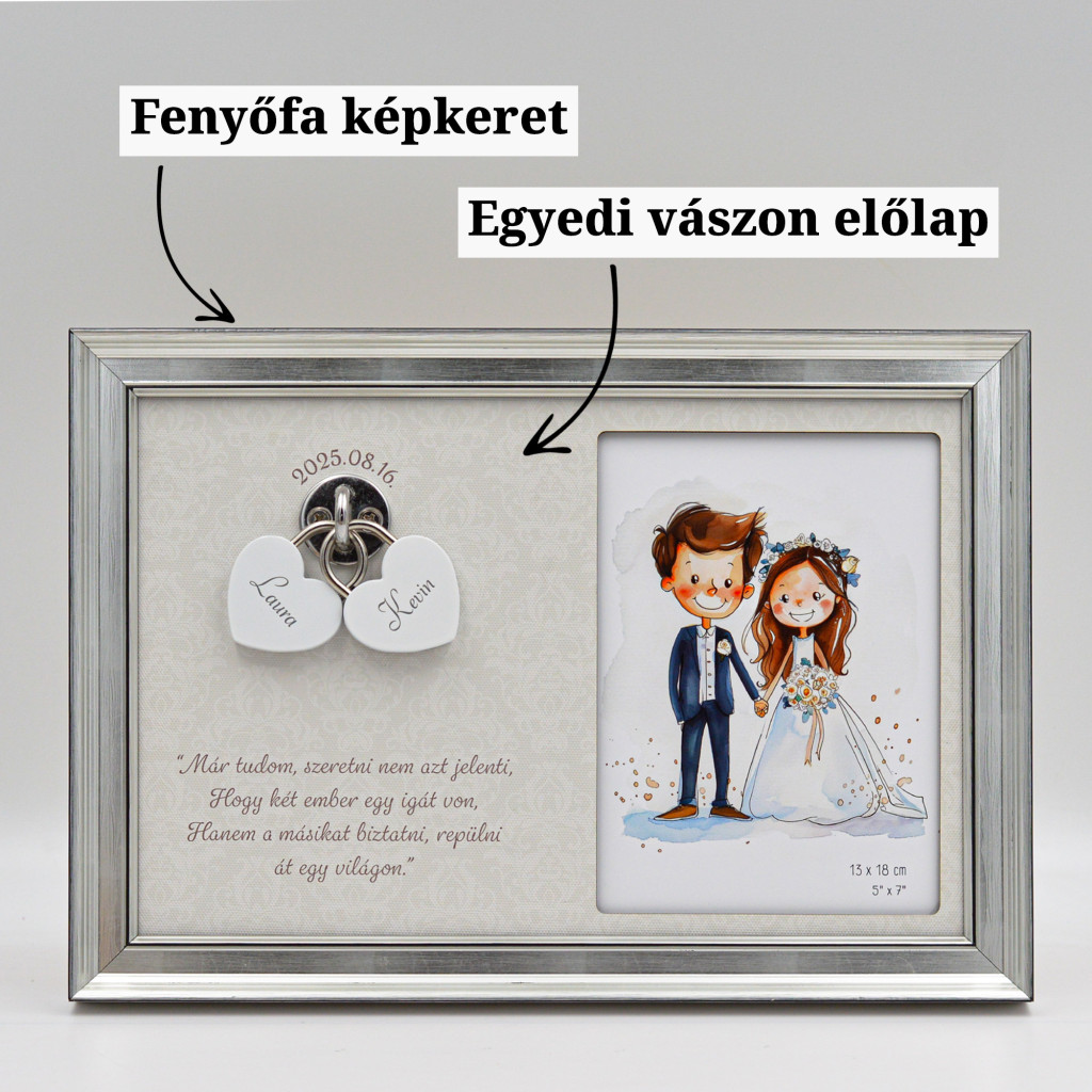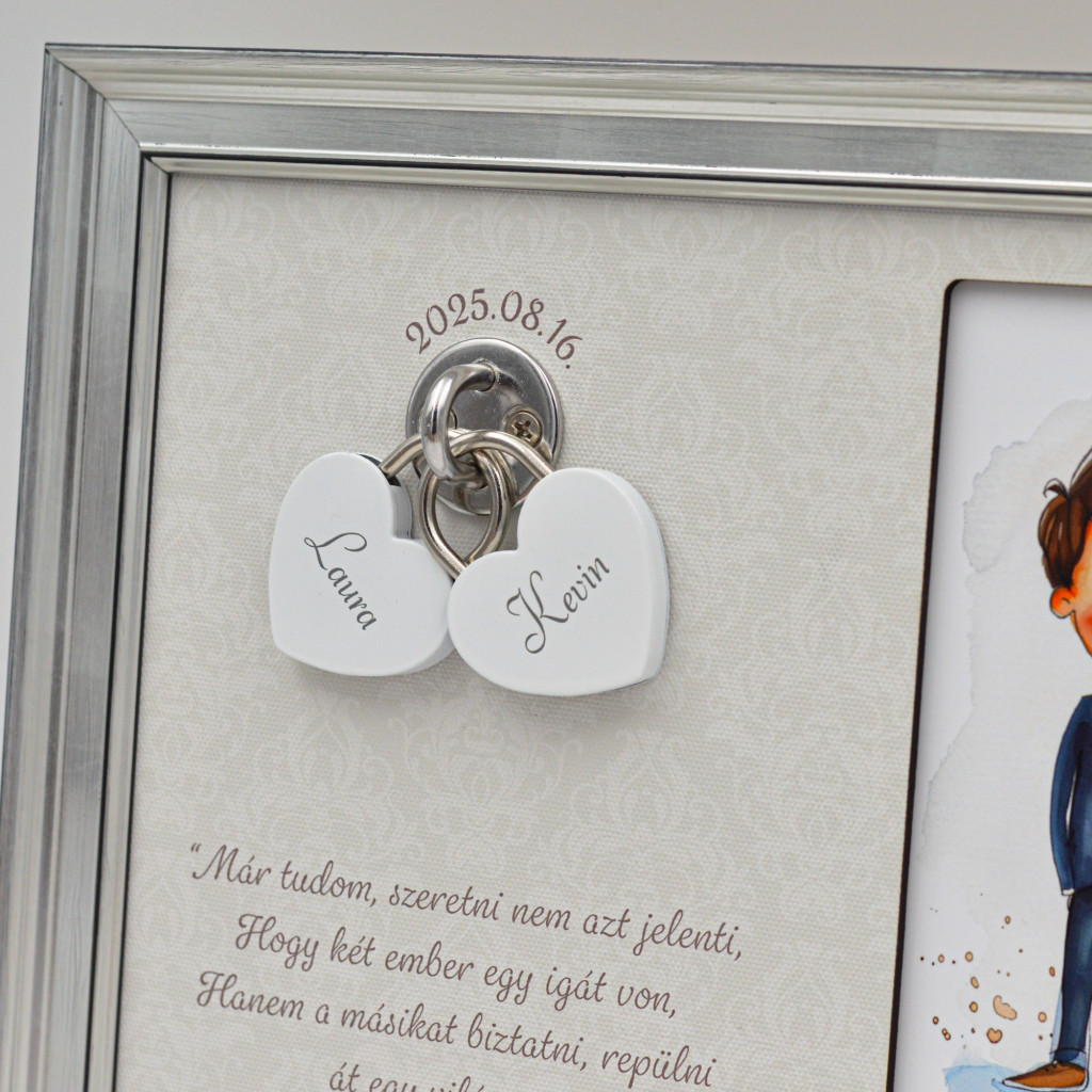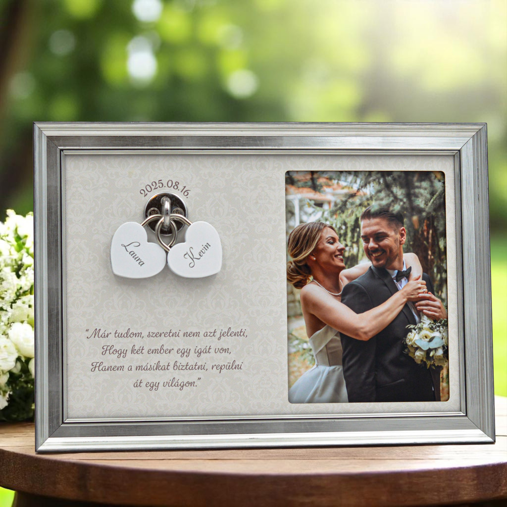 - Gravírozható hátoldal – A képkeret hátlapjára egyedi gravírozás is kérhető – lehet ez egy megható gondolat, egy fontos dátum, vagy egy személyes üzenet az ifjú pár számára, különösen, ha ajándékba szánjátok.