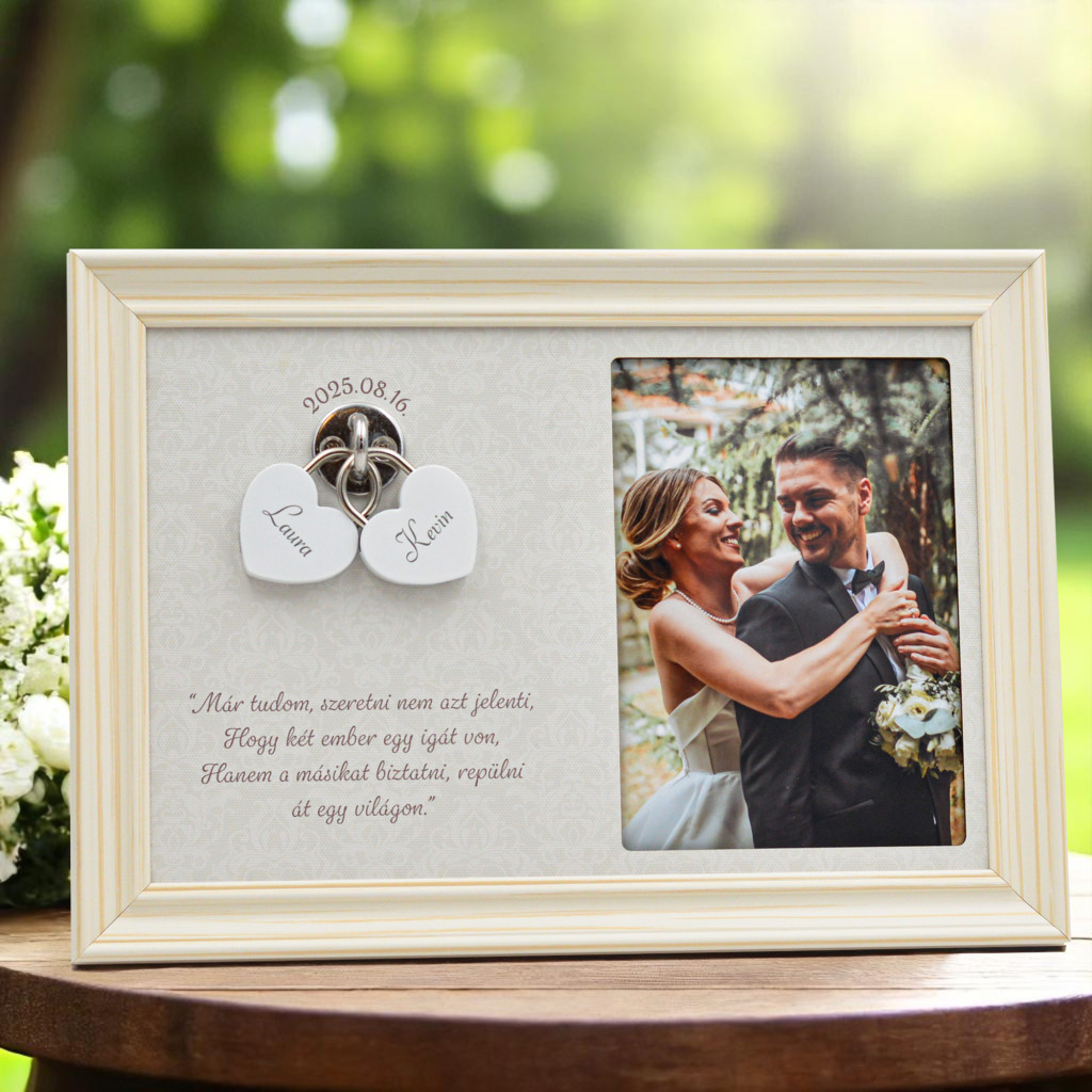- Gravírozható hátoldal – A képkeret hátlapjára egyedi gravírozás is kérhető – lehet ez egy megható gondolat, egy fontos dátum, vagy egy személyes üzenet az ifjú pár számára, különösen, ha ajándékba szánjátok.